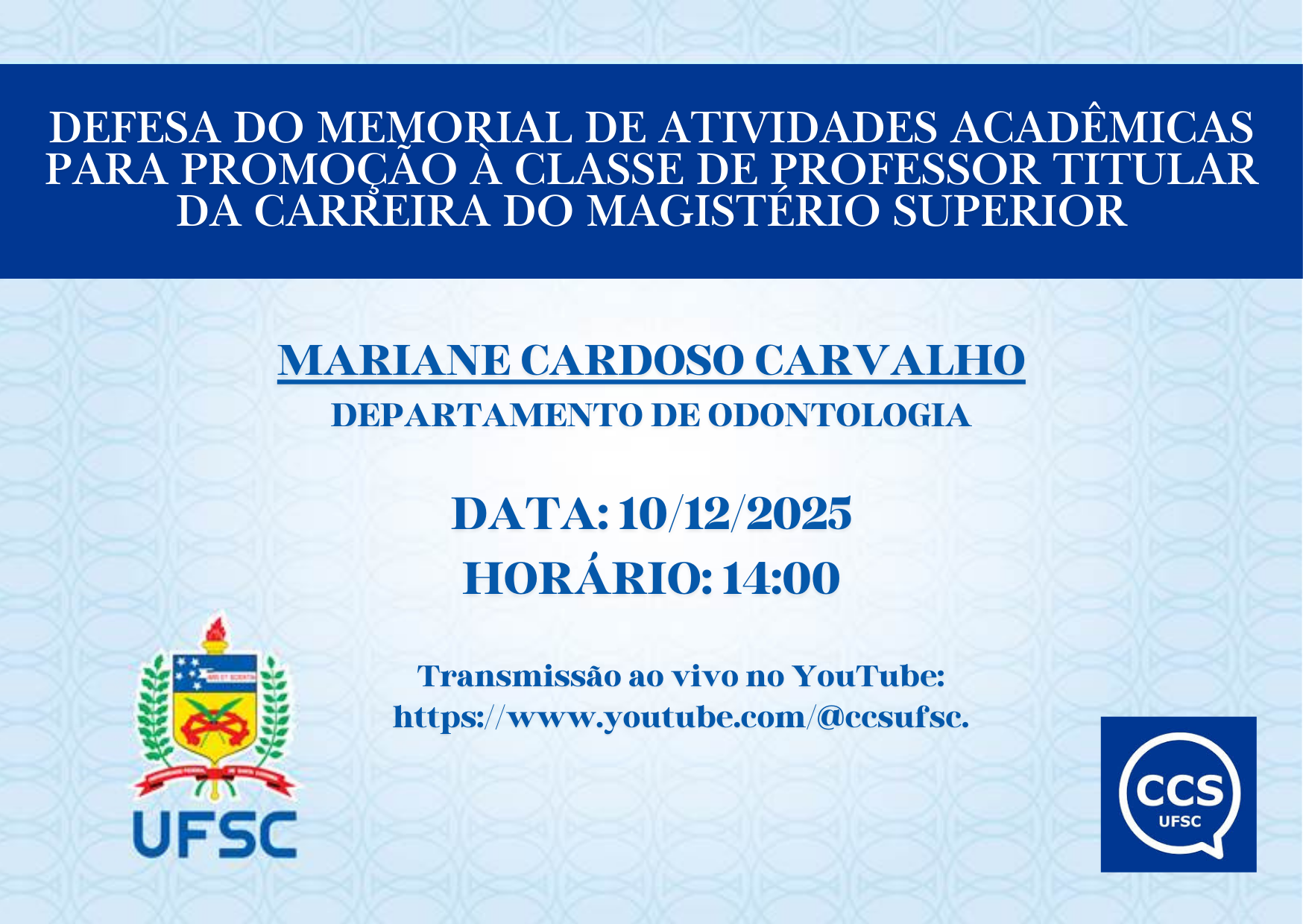 Transmissão ao vivo no YouTube: https://www.youtube.com/@ccsufsc.