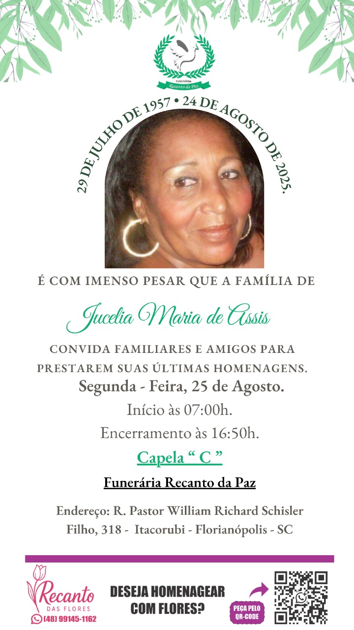 O velório será realizado hoje, 25/08/2025, das 7h às 16h50, na Capela C, no Itacorubi.